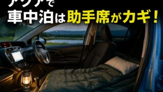 アクアで車中泊をするときに助手席をどう使えば快適に眠れるのかを詳しく解説。シート調整のコツ、段差対策、便利グッズ、安全面の注意、朝の片付けまでまとめてわかります。