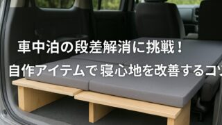 車中泊マット・寝具 車中泊の段差解消に挑戦!自作アイテムで寝心地を改善するコツ 車中泊の段差解消は自作で解決可能。合板や収納ボックスを使ったDIYアイデアやメリット、注意点を紹介。市販品との比較も含めて、快適な車中泊を実現する方法を解説します。 車中泊マット・寝具