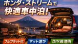 エルグランドは日産の高級ミニバンとして知られ、室内空間が非常に広く、車中泊に適した構造を持っています。フルフラットに近い状態までシートを倒せるため、マットを敷くスペースが確保しやすいのが大きな魅力です。