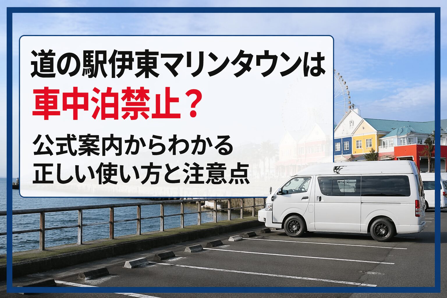 伊東マリンタウンについては、「全面的に禁止」という強い印象だけで語ると実態を見誤りやすくなります。大切なのは、駐車場が休憩施設として案内されていること、長期滞在やキャンプ行為などの目的外利用が断られていること、この二つをセットで理解することです。